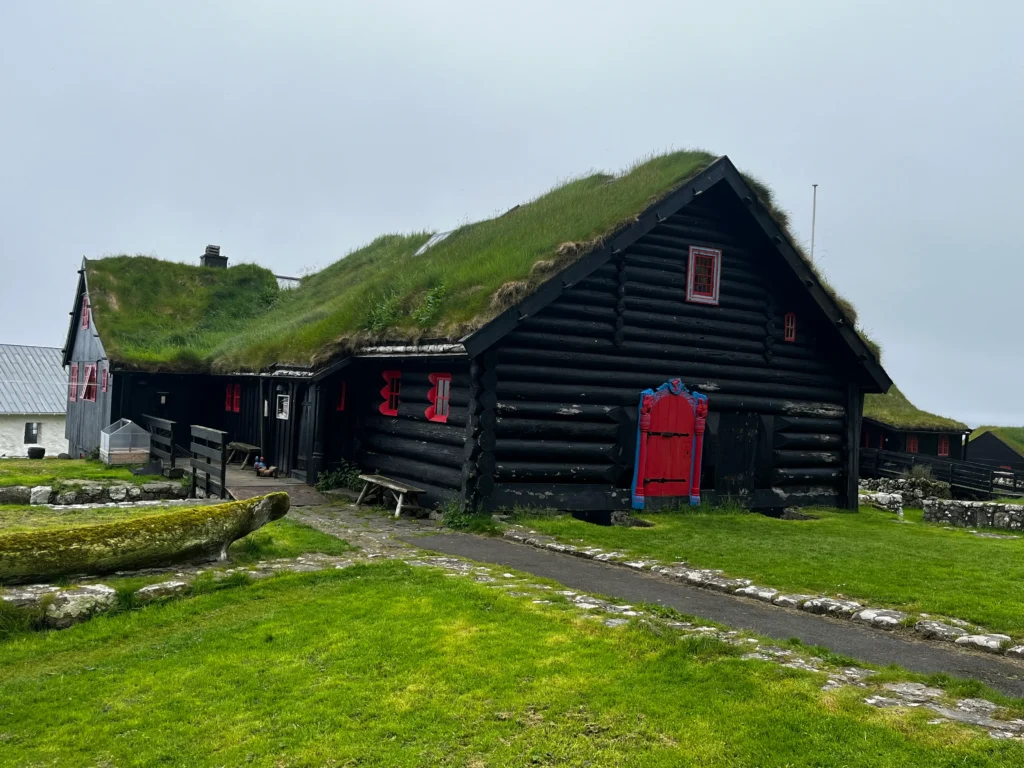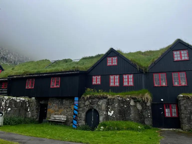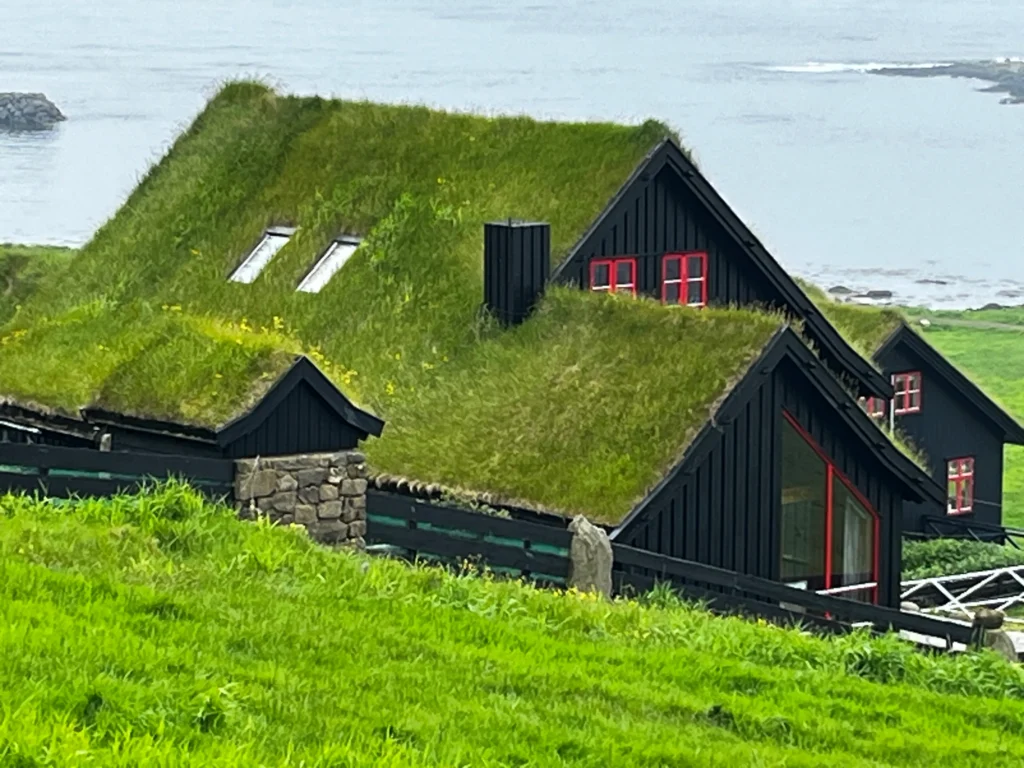 Uma das marcas mais pitorescas das Ilhas Faroé, são as casas com telhados cobertos de grama, um traço encantador da arquitetura local que se mistura à natureza, como se as construções brotassem da própria terra.