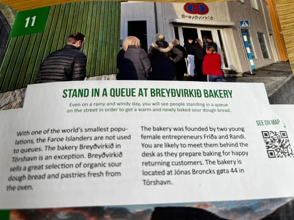 Fiquei hospedada na capital Torshvan, na rua 42 Jonas Bronksgota, bem ao lado da famosa panificadora, Breyðvirkið (Braydvirkid), mencionada nos guias de viagem como parte da história autêntica do local. São pães artesanais feitos com fermentação natural, pelas jovens empreendedoras Frida e Randi. Os pães são tão disputados, que muitas vezes é necessário ficar em fila na calçada.