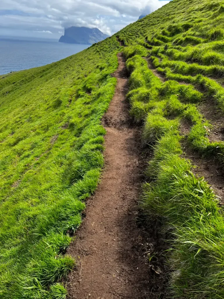 A trilha começa perto do vilarejo de Miðvágur e leva cerca de 1 hora (só ida), passando por paisagens verdes e ventosas até chegar ao ponto onde o lago parece desaguar direto sobre o mar.