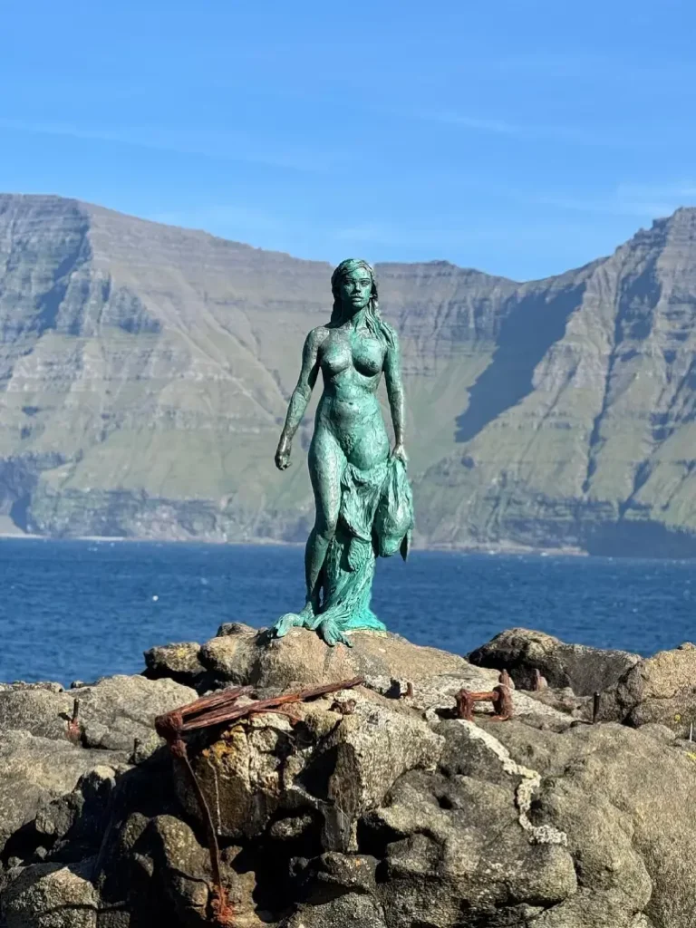 - A estátua da mulher-foca (Kópakonan) em Mikladalur, que homenageia uma das mais famosas lendas feroesas — a história trágica de uma criatura mítica capturada por humanos.