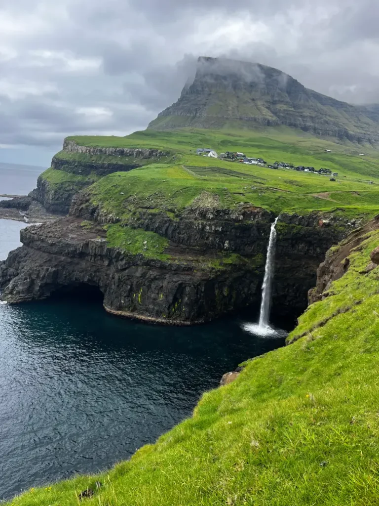 De volta à ilha de Vágar, o destaque do dia é Gásadalur, um dos vilarejos mais fotogênicos das Ilhas Faroé, e onde fica a espetacular cachoeira Múlafossur, que despenca diretamente no mar, com montanhas ao fundo e casas com telhado de grama emoldurando a paisagem.