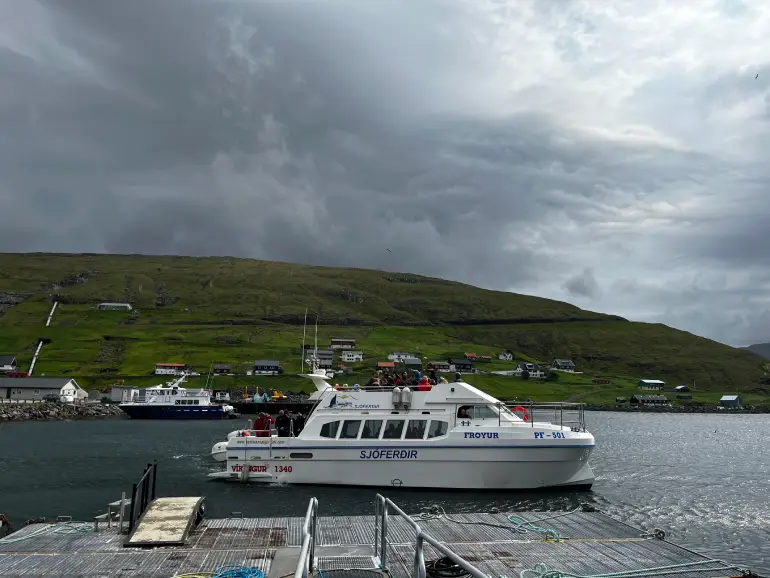 A travessia de balsa leva cerca de 30 minutos e desembarca no pequeno porto de Syðradalur. A partir dali a viagem é feita em ônibus, por 17km, até o vilarejo de Trollanes.