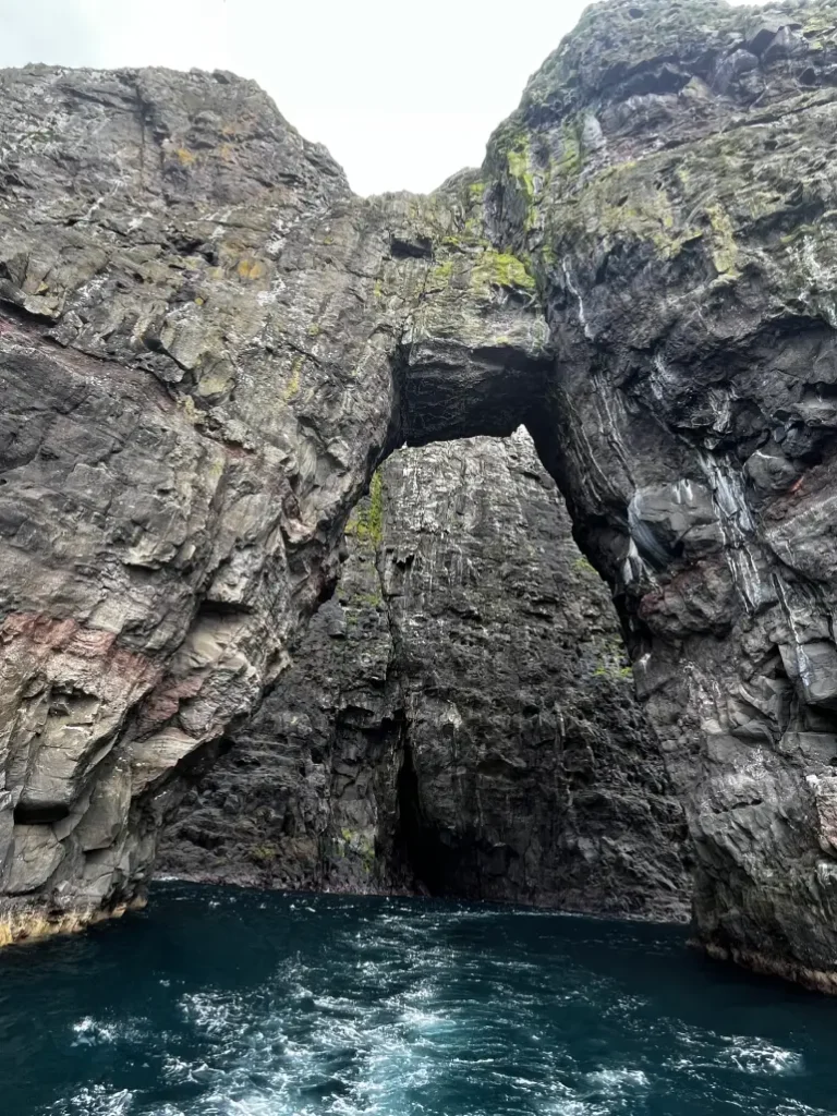 Saindo da baía de Vestmanna, na ilha de Streymoy, embarque para um passeio de barco de cerca de 1h30. O trajeto percorre falésias imponentes, túneis naturais e cavernas marinhas, revelando formações rochosas esculpidas pelo vento e pelas ondas. Uma experiência que mostra a natureza faroesa em sua forma mais bruta.